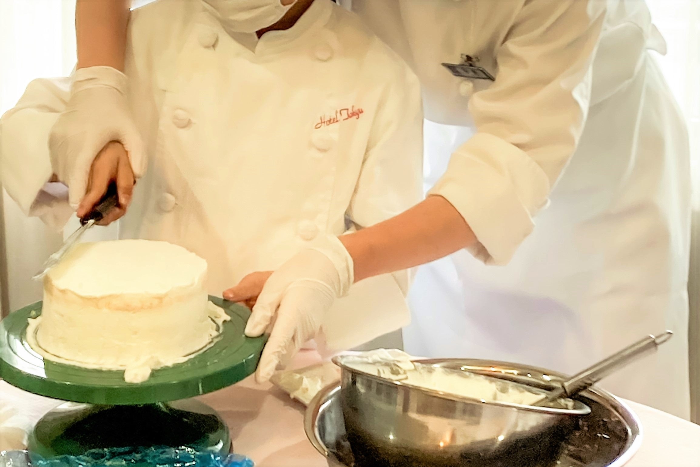 当ホテルのパティシエが講師となり、プロの技を織り交ぜながら、ケーキ作りを丁寧にレクチャー。親子のコミュニケーションを深めながら、ケーキのデコレーション体験に挑戦していただきます。さらに、より本格的にパティシエ気分がお楽しみいただけるよう、お子様用のコックコートとコック帽をご用意しました(サイズが合わない際は、エプロンをご持参いただく場合がございます)。ケーキ作りの際は、お客様ご自身での写真撮影に加え、当ホテルのパティシエとの記念撮影タイムも設けておりますので、プロ顔負けのコックコート姿の写真を思い出にたくさんお持ち帰りください。