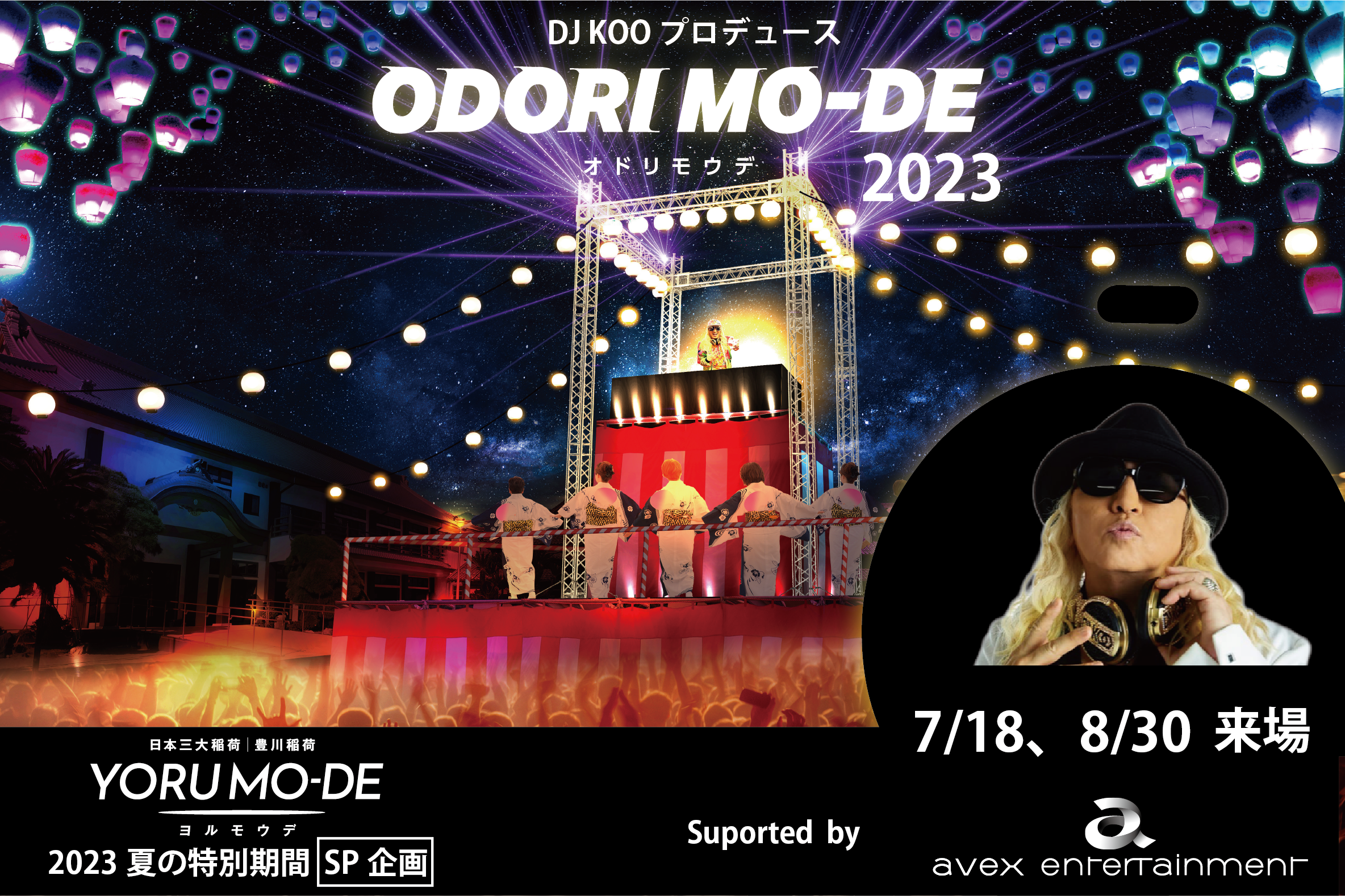 7月18日(火)に開催を予定するヨルモウデ 夏の特別期間2023のオープニングイベント及び、最終日8月30日(水)のスペシャル企画として、ODORI MO- DE(オドリモウデ)をプロデュースするDJ KOO氏が両日来場。合わせて7月18日(火)には古田愛理、高柳明音、田辺莉咲子、8月30日(水)にはUKOON(ウコーン)孝藤右近が来場予定で、当日を盛り上げます。