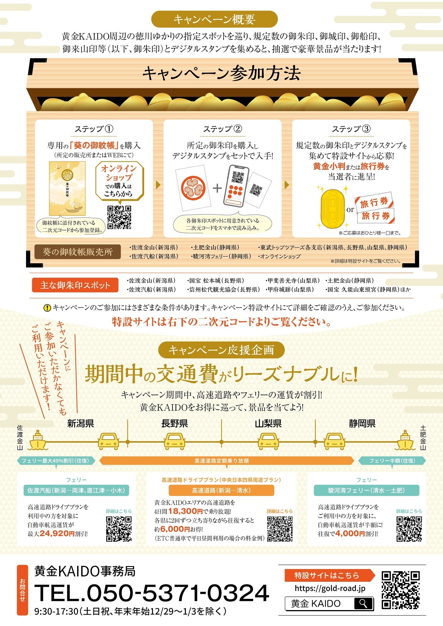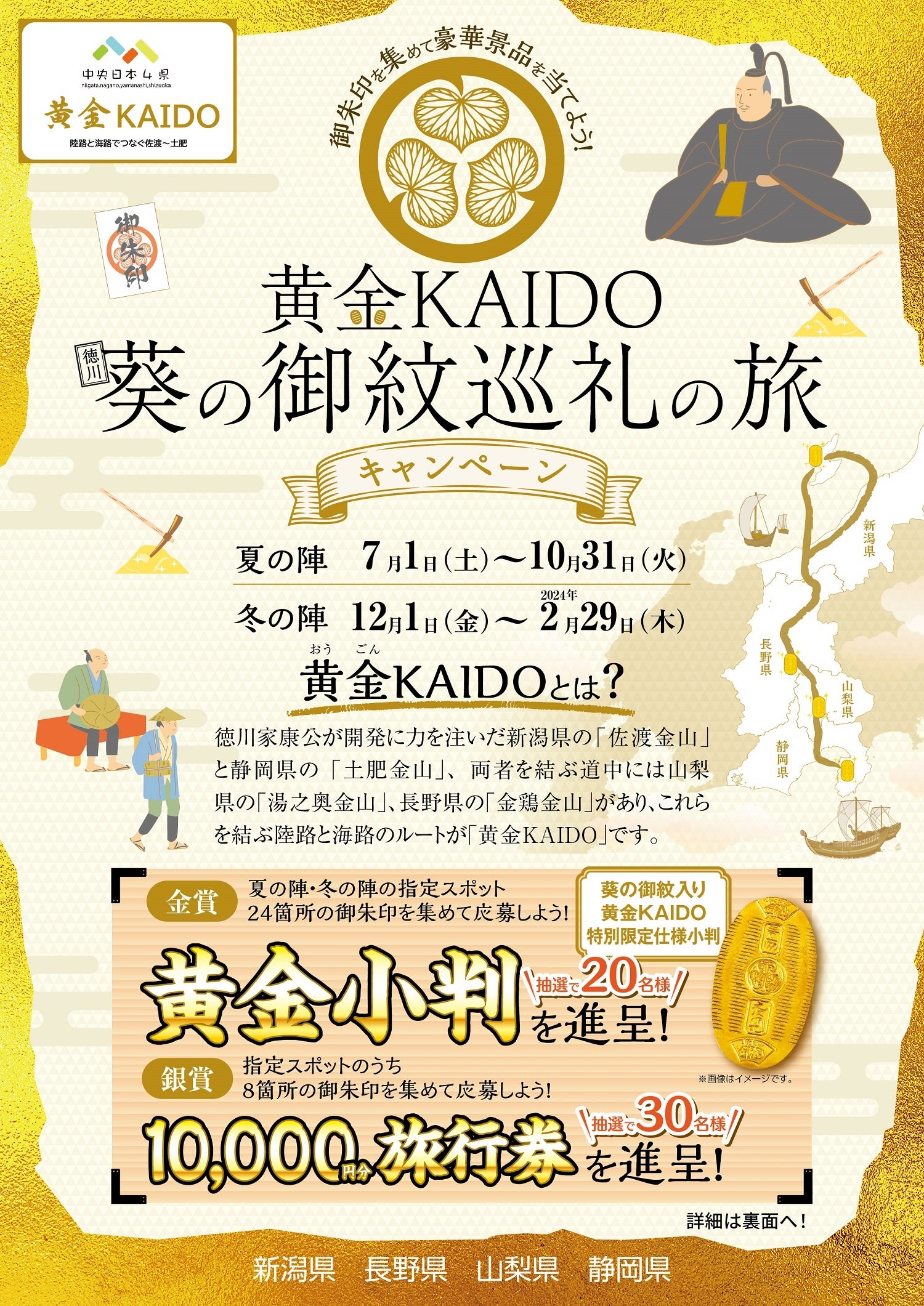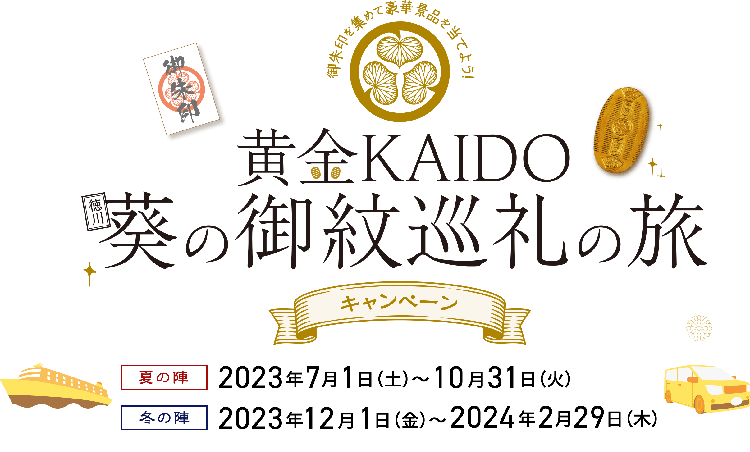 〈金賞〉 夏の陣、冬の陣の指定スポット24箇所の御朱印を集めて応募 ・葵の御紋入り黄金KAIDO限定仕様の小判を抽選で20名様に進呈 〈銀賞〉 指定スポットのうち8箇所の御朱印を集めて応募 ・10,000円分の旅行券を抽選で30名様に進呈 |
