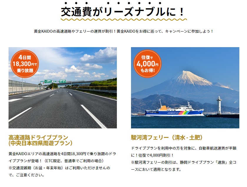 中央日本四県(新潟県、長野県、山梨県、静岡県)域内での交流促進や、域外からの誘客を目的に、NEXCO中日本及びNEXCO東日本の協力の下、「黄金KAIDOエリア」などの高速道路料金が定額で、乗り放題となるドライブプランとフェリー運賃の割引を実施します。