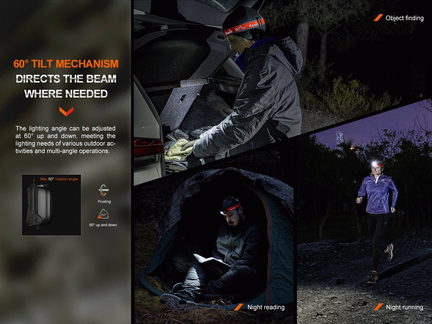 ライトが60度回転し、照明範囲を上下に調整できるため、様々な使用シーンに対応しています。
