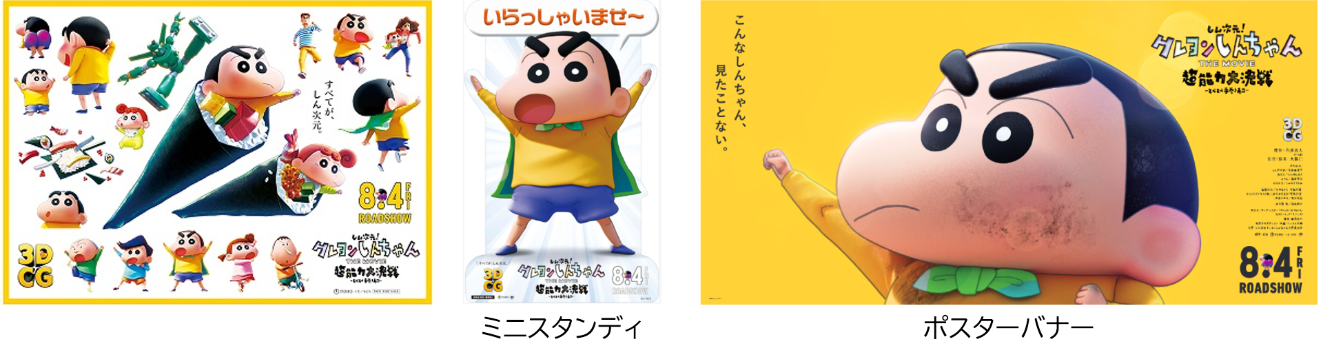 会場に掲出するイベント案内ポスター、イベントの参加特典として配布できるステッカーが基本パッケージに付属します。またオプションとして、しんちゃんのミニスタンディ、映画オリジナルのポスターバナーもご用意しています。