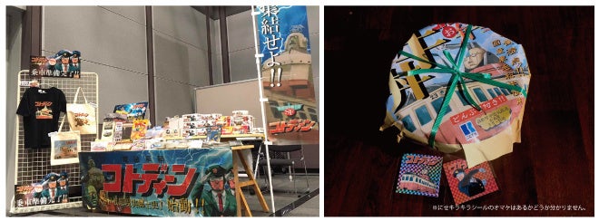 コトディーンの世界観を最大限に詰め込んだ関連商品も製作しています。独特の世界観で統一された、香川の新たな観光土産を目指しています。スタンプラリーのための「スタンプ手帳のセット」から、「コトディーン絵葉書」や「コトディーンキラキラシール」、また各イベントでは架空の駅弁「コトディーン牛丼弁当(丼付き)」も販売しています。スタンプラリーにご参加できない遠方の皆様にもコトディーンを愉しんでいただくためのツールにもなっています。