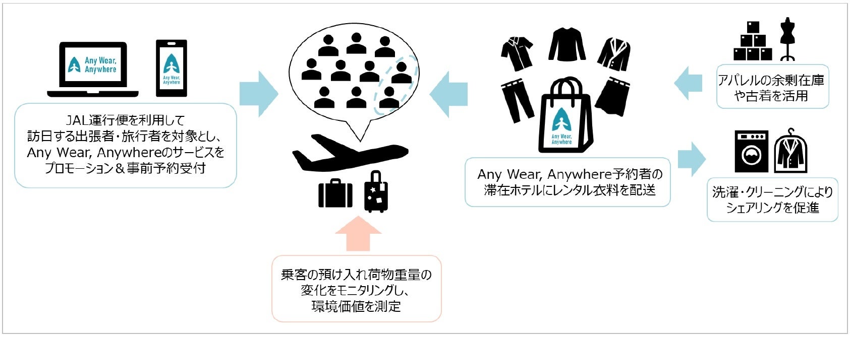 日本航空株式会社(以下「JAL」)と住友商事株式会社(以下「住友商事」)は、JAL運航便を利用する 海外から日本への旅行・出張者を対象とした衣料シェアリングサービス「Any Wear, Anywhere」(以下「本サービス」)を提供し、本サービス利用に伴う環境価値を計測する実証実験を開始します。