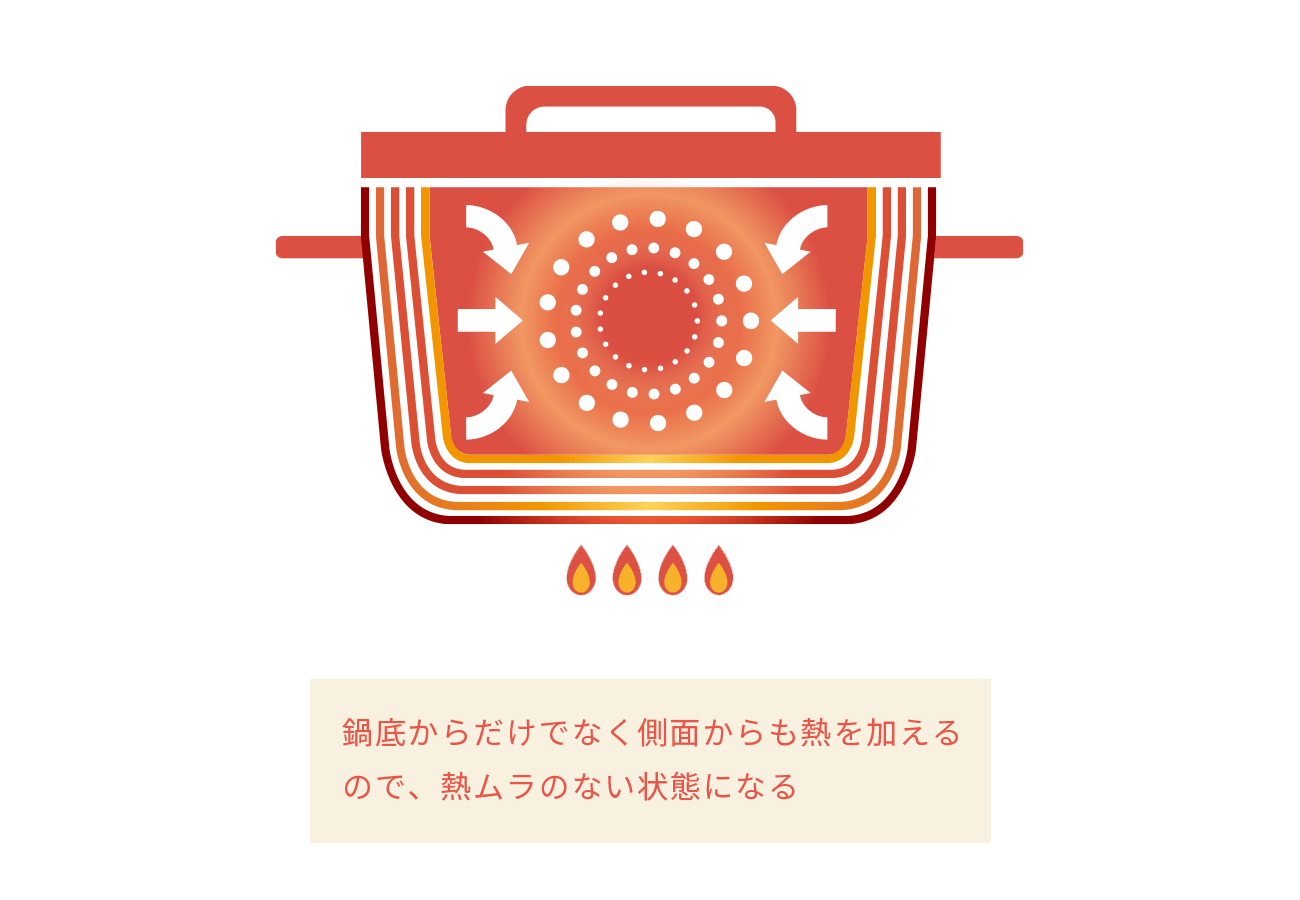 全面5層構造の優れた熱伝導性によって、鍋底にあたった熱が鍋全体に素早く伝わり、全方向から均一に熱を加えることができます。