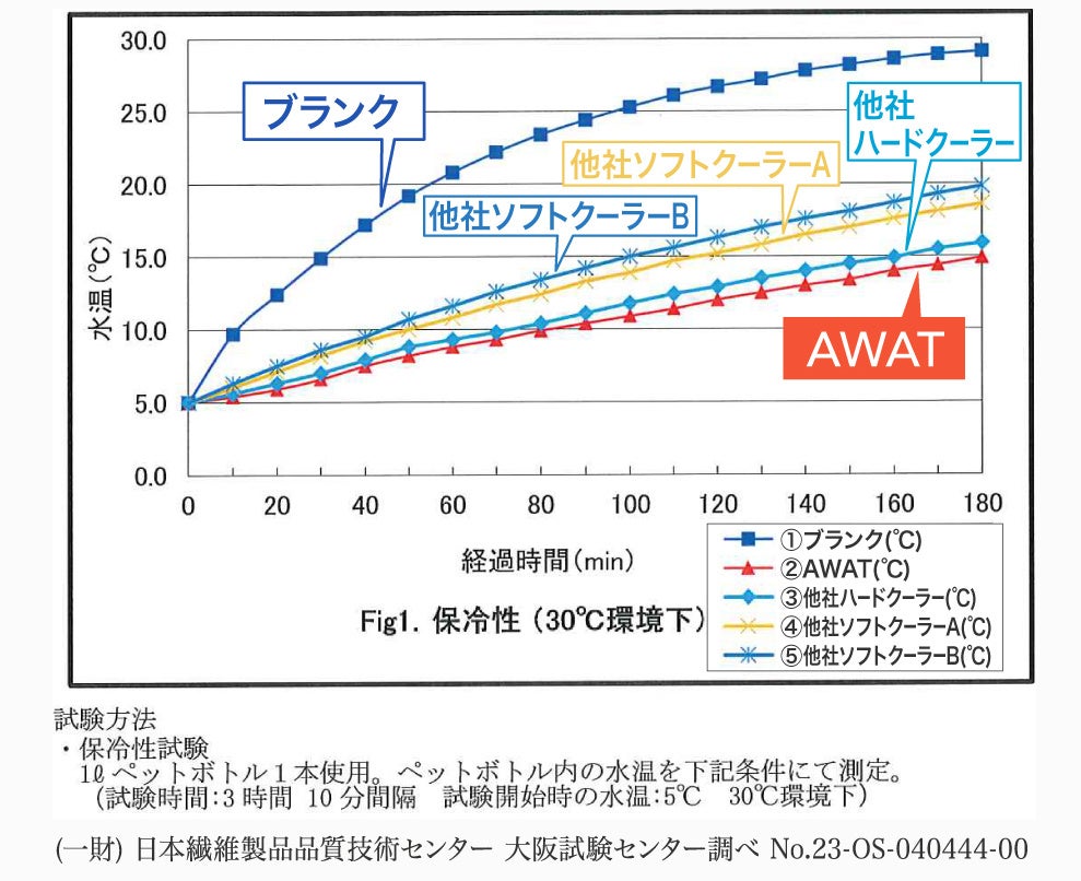 市販の製品とその保冷力を比較する試験を第三者機関に依頼した結果、ハードクーラーボックスを超える保冷性能が認められました。