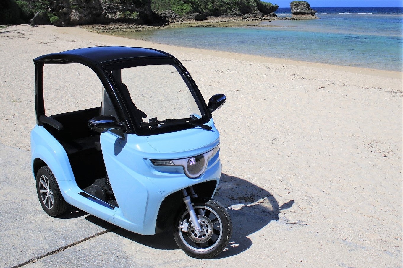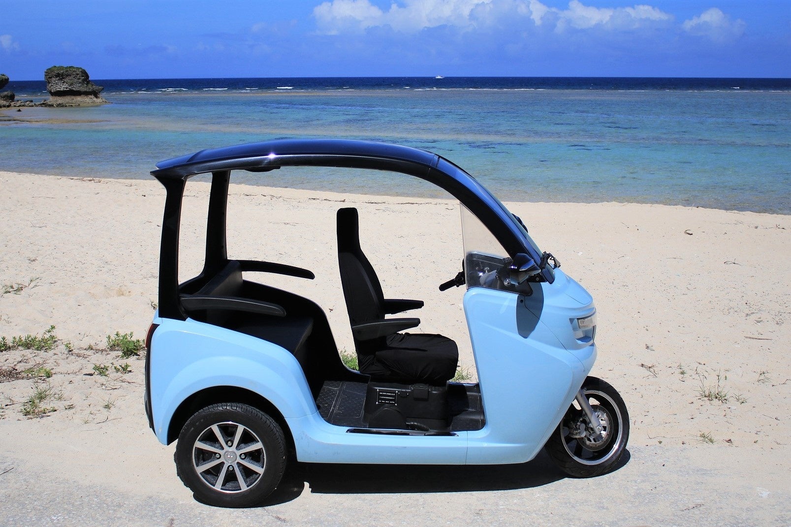 eMoBiの電動トゥクトゥクは、従来の東南アジアのトゥクトゥクの良さであるオープンな構造で、走る時の爽快感を残しつつオリジナルにリデザインされた、使って便利かつ乗って楽しい3人乗りの次世代コンパクトEVです。エンジン音のないEVならではの静かな車内で音楽や会話を楽しみながら程よいスピードで風を感じつつ、風景をより新鮮に体験できます。環境配慮の観点でも、電動トゥクトゥクは完全電動のため、排気ガスやエンジン音もなく自然豊かな沖縄の環境に優しい車両です。普通自動車サイズの電気自動車に比べ必要とする電力量が非常に少なく、発電時に発生すると考えられる二酸化炭素排出の削減になります。