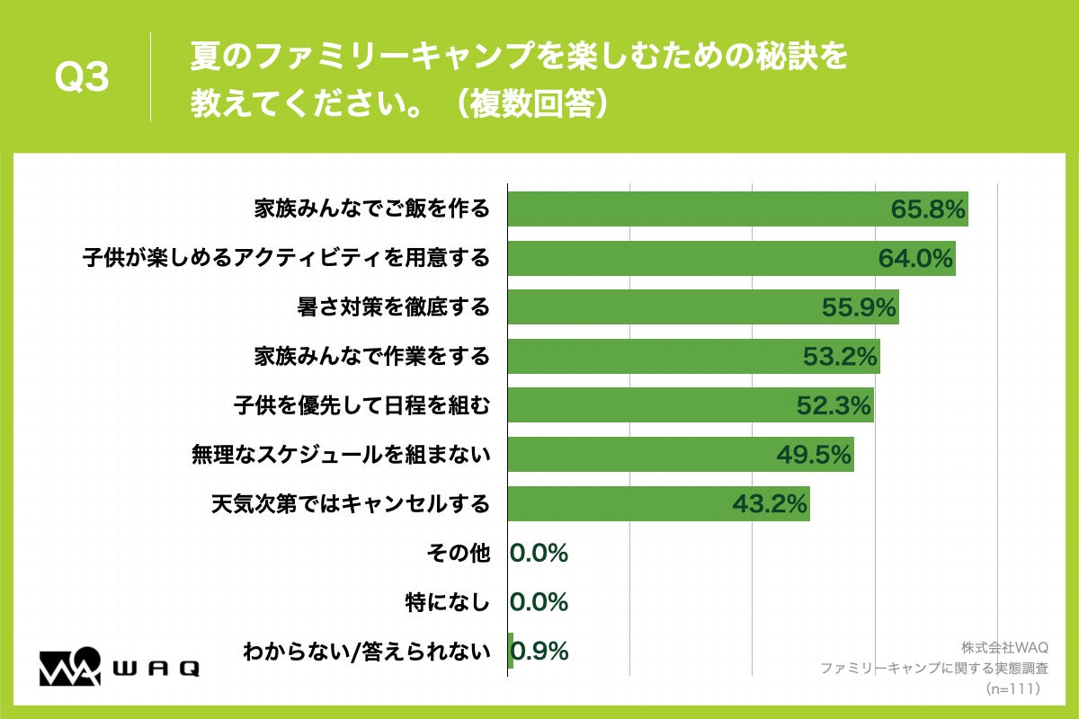 「Q3.夏のファミリーキャンプを楽しむための秘訣を教えてください。(複数回答)」(n=111)と質問したところ、「家族みんなでご飯を作る」が65.8%、「子供が楽しめるアクティビティを用意する」が64.0%、「暑さ対策を徹底する」が55.9%という回答となりました。