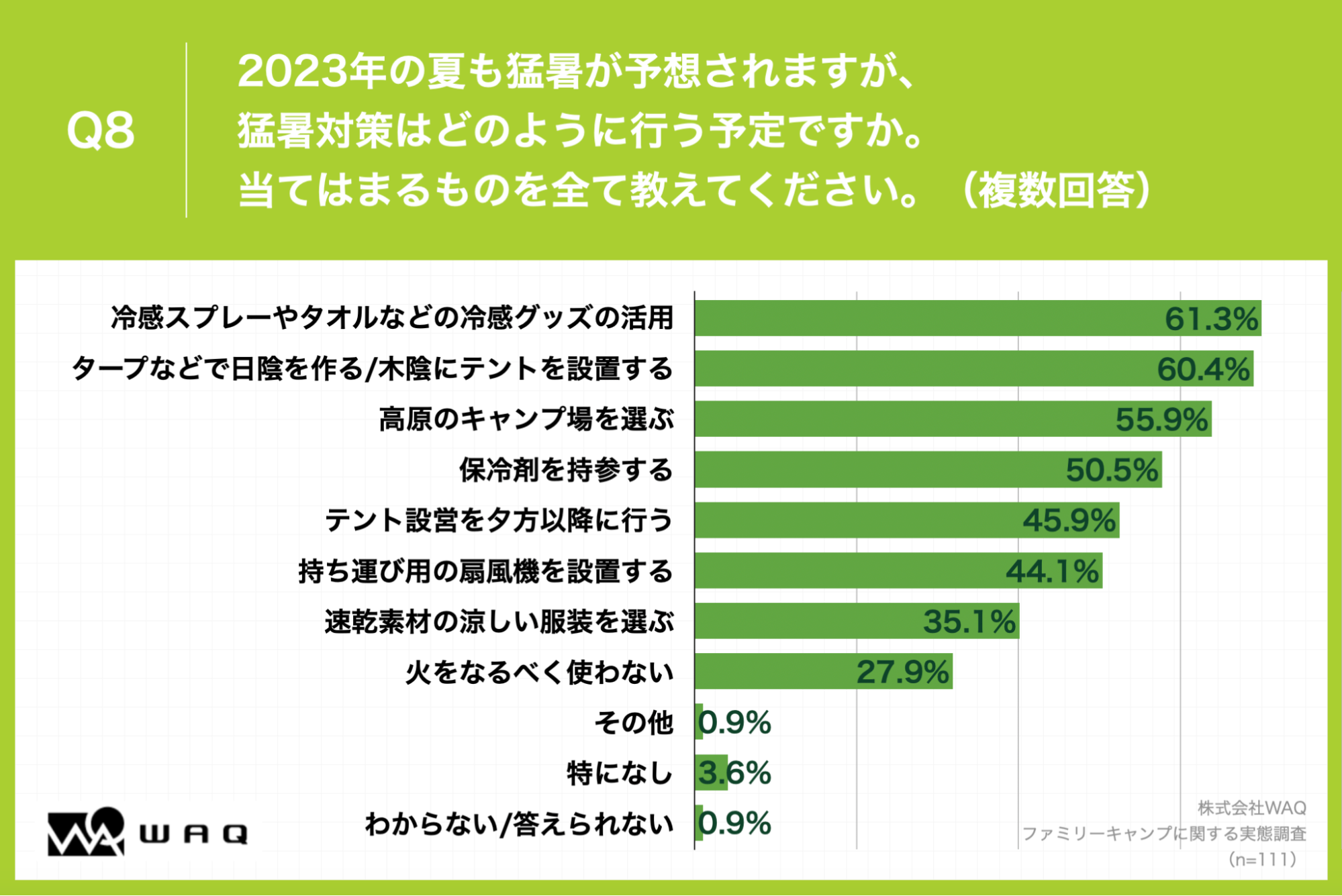 「Q8.2023年の夏も猛暑が予想されますが、猛暑対策はどのように行う予定ですか。当てはまるものを全て教えてください。(複数回答)」(n=111)と質問したところ、「冷感スプレーやタオルなどの冷感グッズの活用」が61.3%、「タープなどで日陰を作る/木陰にテントを設置する」が60.4%、「高原のキャンプ場を選ぶ」が55.9%という回答となりました。