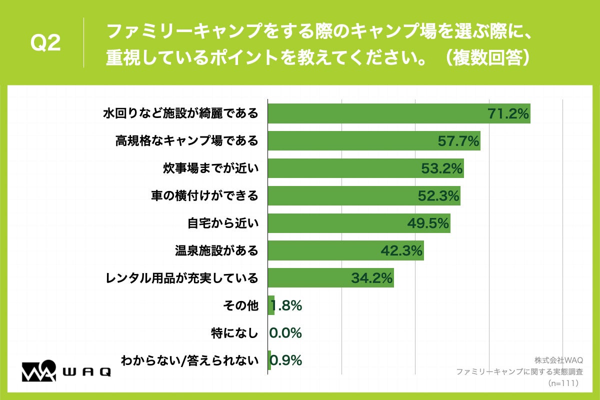「Q2.ファミリーキャンプをする際のキャンプ場を選ぶ際に、重視しているポイントを教えてください。(複数回答)」(n=111)と質問したところ、「水回りなど施設が綺麗である」が71.2%、「高規格なキャンプ場である」が57.7%、「炊事場までが近い」が53.2%という回答となりました。