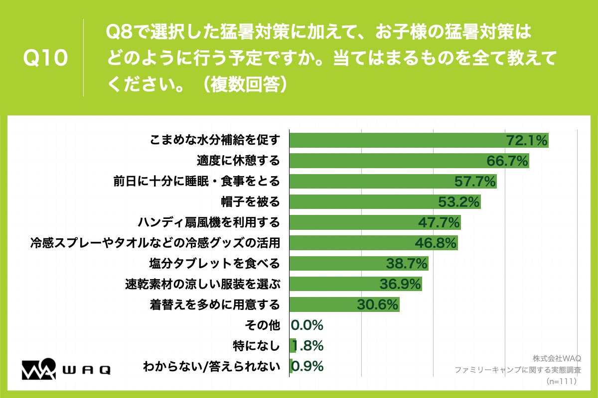 「Q10.Q8で選択した猛暑対策に加えて、お子様の猛暑対策はどのように行う予定ですか。当てはまるものを全て教えてください。(複数回答)」(n=111)と質問したところ、「こまめな水分補給を促す」が72.1%、「適度に休憩する」が66.7%、「前日に十分に睡眠・食事をとる」が57.7%という回答となりました。