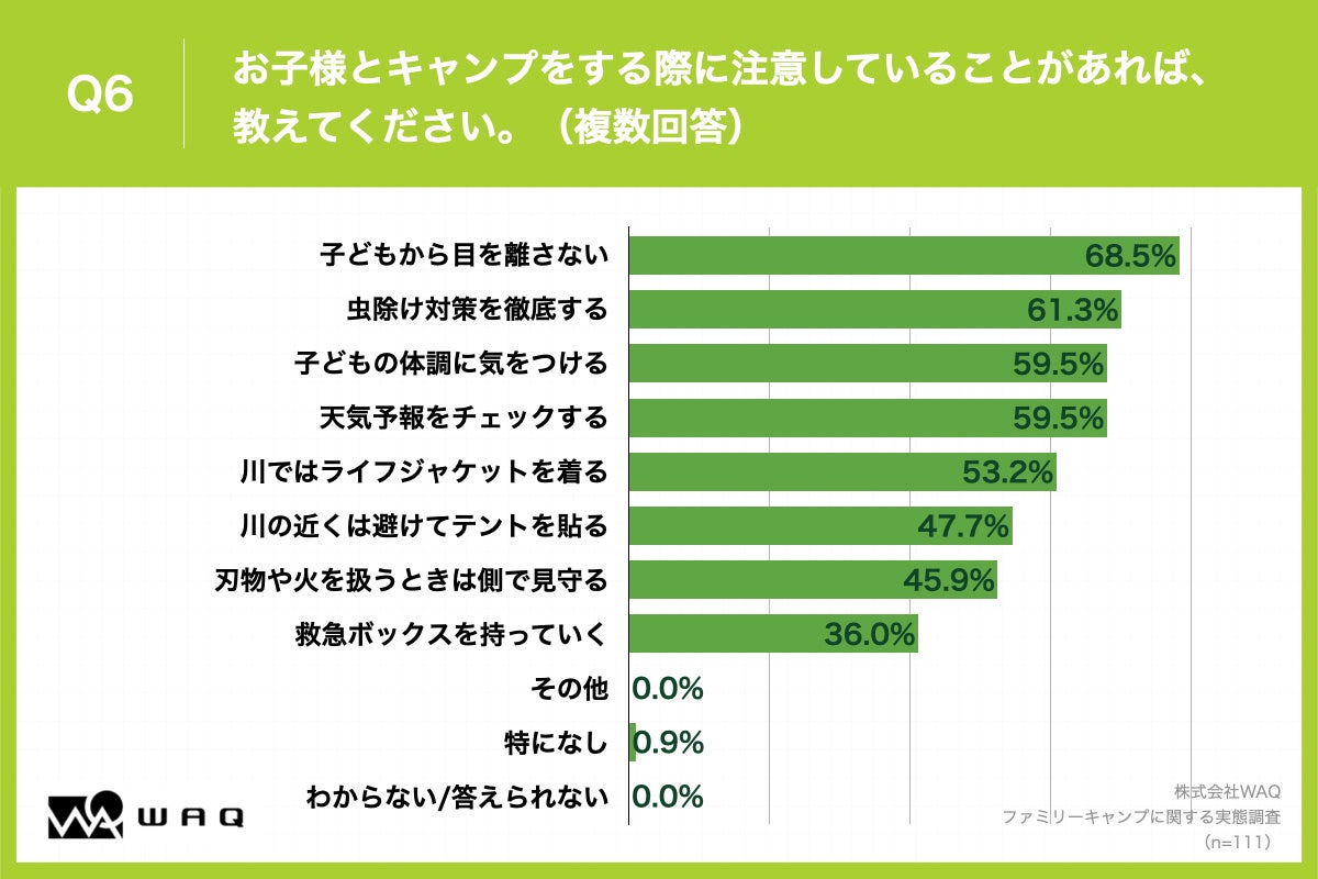 「Q6.お子様とキャンプをする際に注意していることがあれば、教えてください。(複数回答)」(n=111)と質問したところ、「子どもから目を離さない」が68.5%、「虫除け対策を徹底する」が61.3%、「子どもの体調に気をつける」が59.5%という回答となりました。