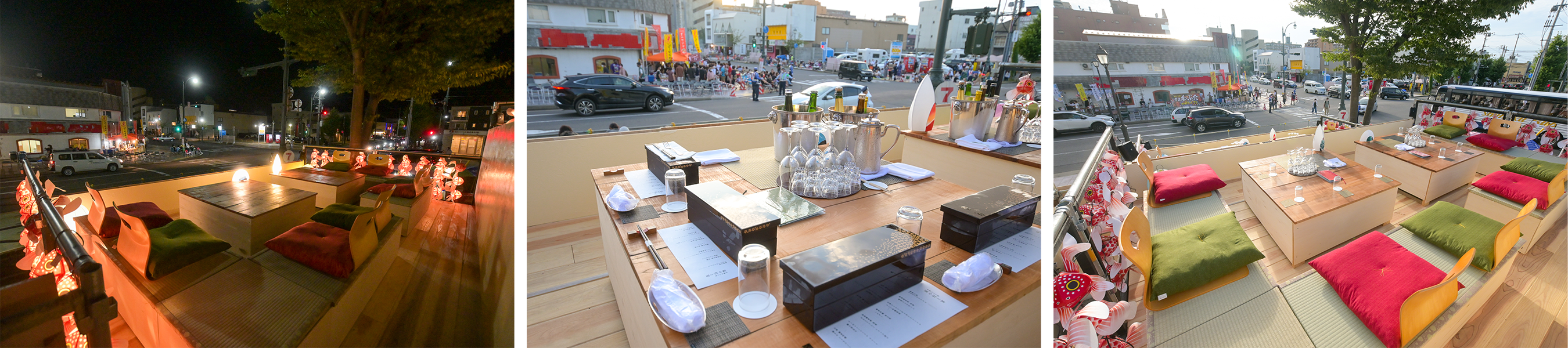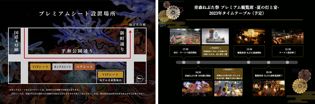 4年ぶりの通常開催となる今回!そして昨年の初実施後にいただきました多くの反響やご好評にお応えし、本年度は100万円のVIPシートの席数を増加してのご提供となります。また、全コースの中でも最も間近に「ねぶた」を楽しめる、ホテル青森のある新町通りから国道4号線を繋ぐ平和公園通りの沿道一面を会場に、ゆったりと過ごせる特別スペースをご用意しました。プレミアム観覧席ならではの特別な空間で、洗練された空間演出と厳選された青森のお酒と食材による豪華なお料理、そしてねぶた文化を継ぐ担い手の想いに触れながら観る特別な観覧体験をご提供致します。