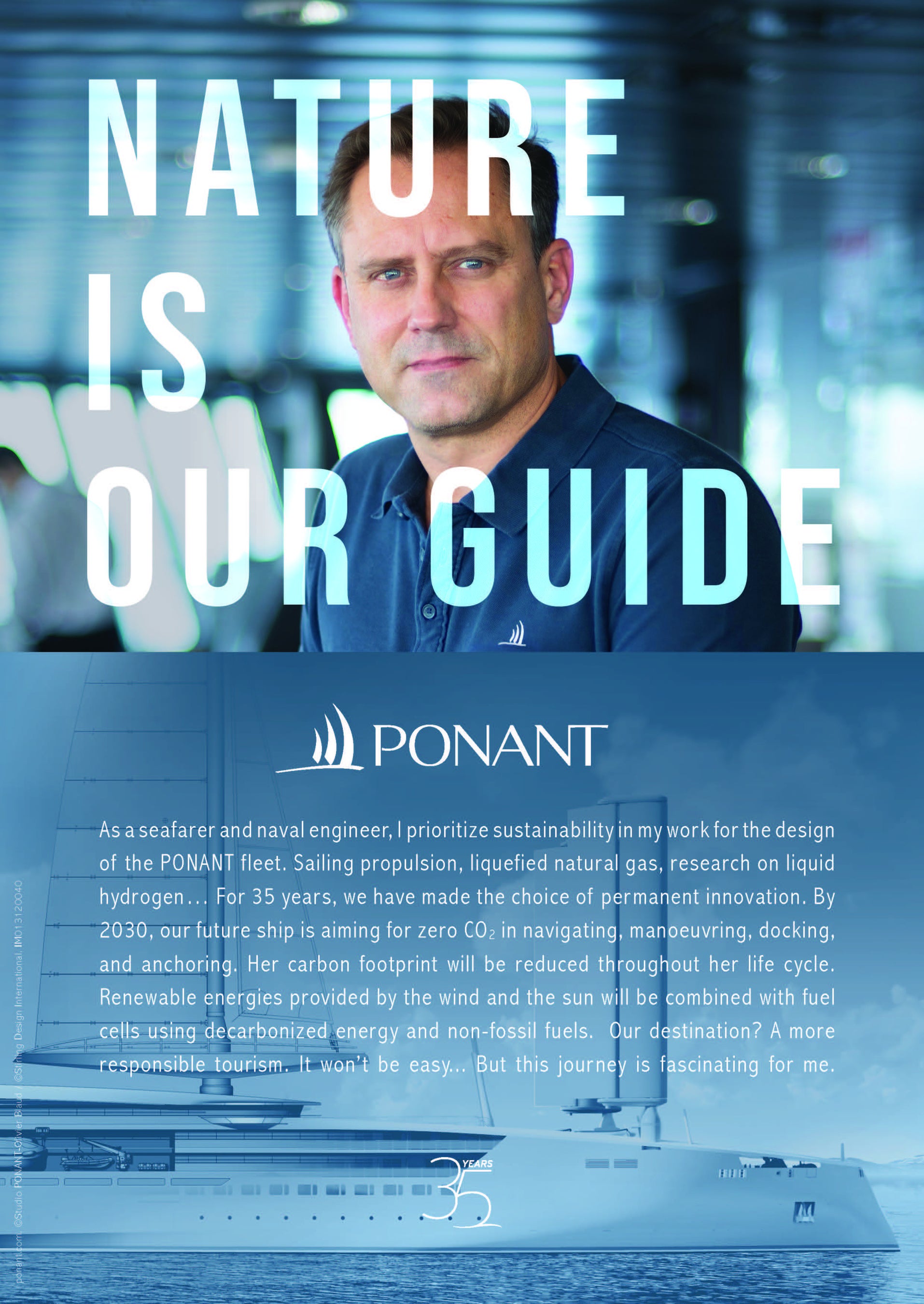 ポナンのエルヴェ・ガスティネルCEOは、「未来の私たちの船は2030年までに、航行中、操船中、港内、停泊中の温室効果ガス排出ゼロを目指します。風と太陽から供給される再生可能エネルギーは、燃料電池による低炭素の非化石エネルギーと組み合わされ、ライフサイクルを通じて二酸化炭素排出量は削減されます。」と説明しました。