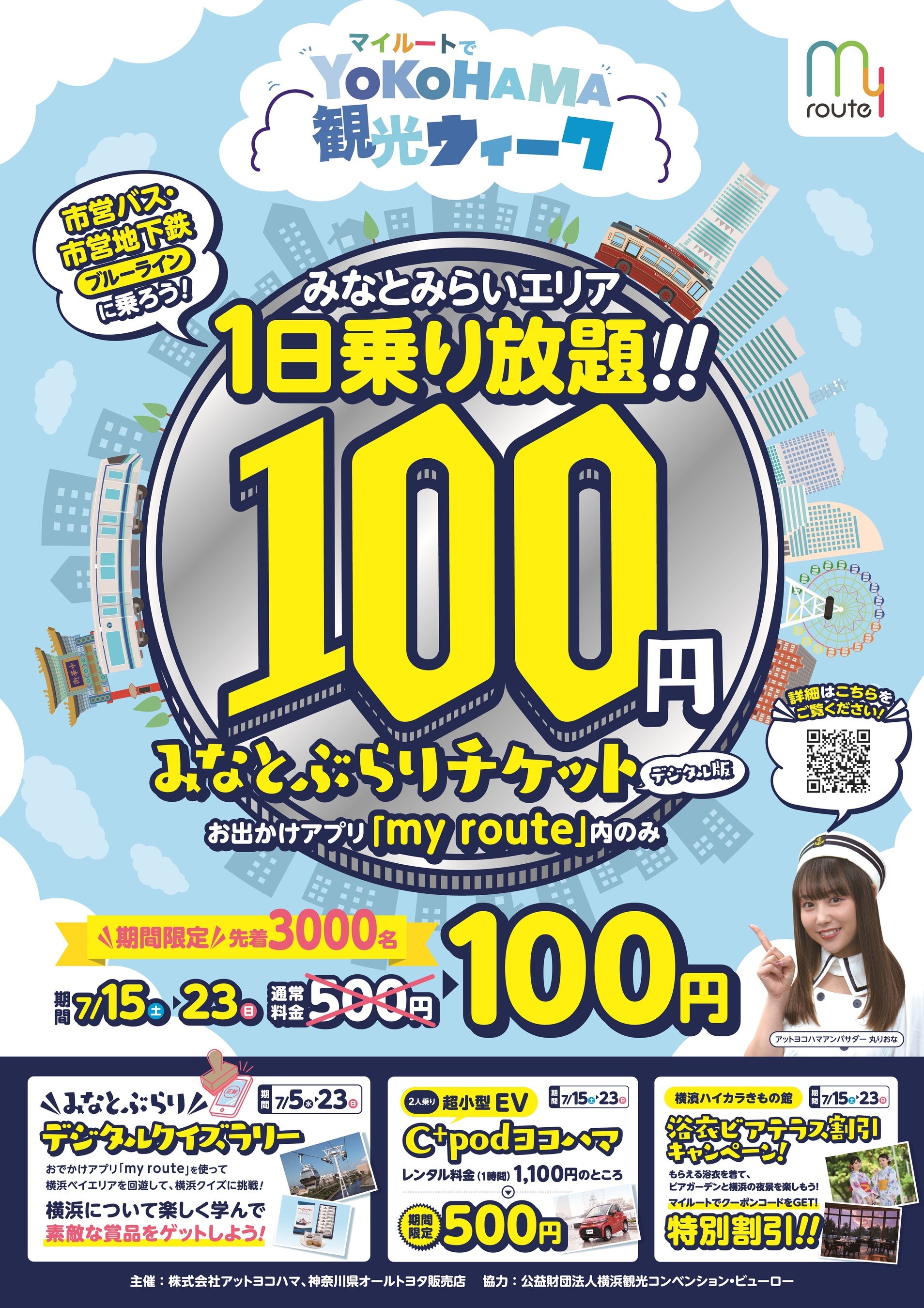 マルチモーダルモビリティサービス『my route (マイルート)※』を横浜で展開する株式会社アットヨコハマ(本社:横浜市神奈川区栄町7-1/代表取締役 上野 健彦、宮原 漢二)は、2020年7月に横浜市都市整備局の公募事業「まちを楽しむ多彩な交通」の一環として『my route』の横浜事業を運営開始しました。それ以来、ご愛顧いただいているユーザーの皆様や地元企業・団体の皆様より厚いご支援をいただき、この度3周年を迎えることができました。皆様に感謝の気持ちを込めて、7月15日(土)より “マイルートでYOKOHAMA観光ウイーク” を開催し、みなとぶらりチケットを先着3,000名様に100円でご提供するなど、マイルートを活用したシームレスな移動体験をご用意いたします。また、キックオフによこはまコスモワールドで “マイルートの日” イベントも実施します。