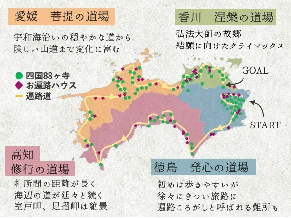 四国遍路は、弘法大師・空海のゆかりの88ヶ所のお寺(札所)をまわるもので、1200年の歴史があります。世界的に有名なスペインの巡礼路、カミノ・デ・サンティアゴと並び、多くの人が悩みや迷いを克服しようと遍路道をたどってきました。