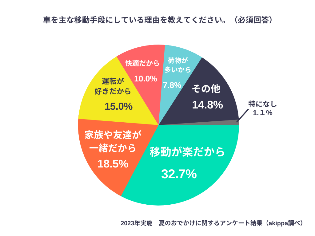車を主な移動手段にしている理由を聞いてみると「移動が楽だから」(32.7%)という声が多く挙げられました。他にも「快適だから」(10.0%)、「荷物が多いから」(7.8%)という回答が挙げられていることから、他の移動手段と比較して利便性をメリットとして車を選択している人が多いことが伺えます。