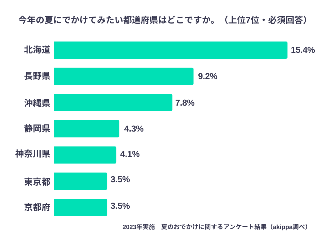 今年の夏にでかけてみたい都道府県を聞いてみたところ「北海道」(15.4%)が第1位という結果になりました。避暑地である「北海道」や第2位の「長野県」(9.2%)は夏のおでかけ先として人気が高いことがわかります。第3位には「沖縄県」(7.8%)がランクインしており、夏にはマリンスポーツが楽しめるリゾート地として根強い人気があることが伺えます。