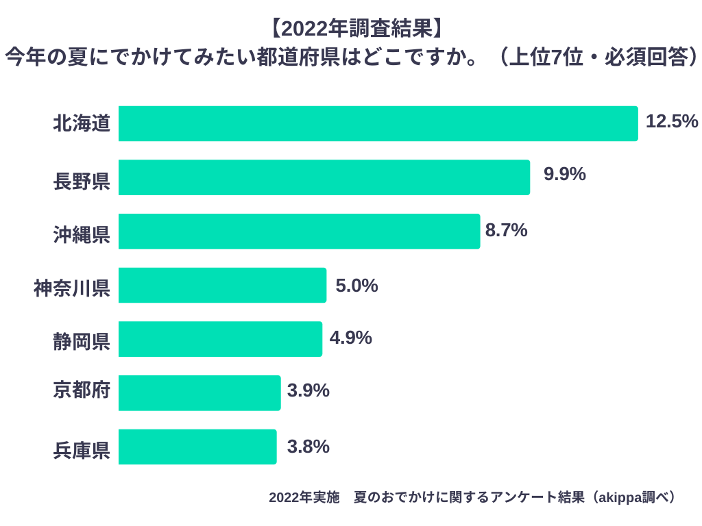 2022年の調査結果と比較してみると、ランクインしている都道府県に大きな変化はないものの、2022年にはなかった「東京都」(3.5%)がランクインしており、都心部へのおでかけを考えている人もなかにはいることが推測できます。