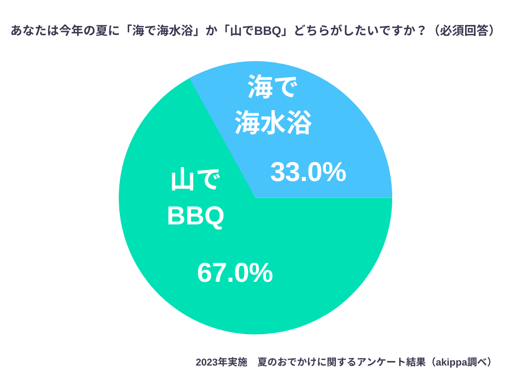 今年の夏に「海で海水浴」か「山でBBQ」、どちらがしたいかを聞いたところ「山でBBQ(67.0%)」が「海で海水浴(33.0%)」を上回る結果となりました。