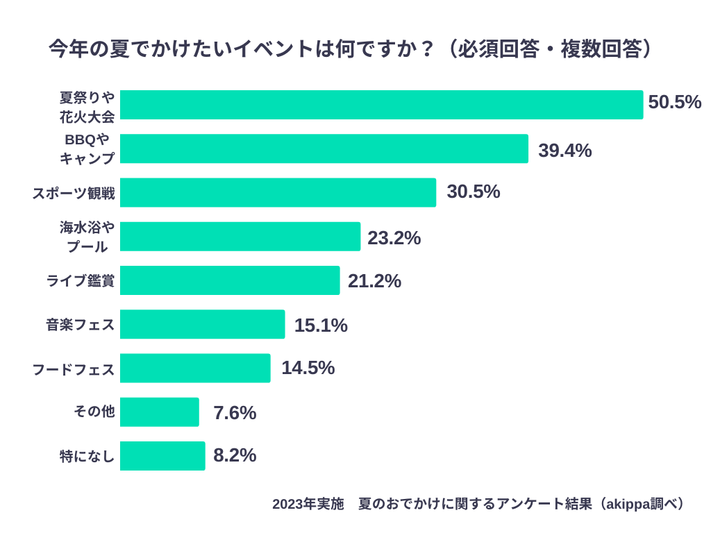 今年の夏にでかけたいイベントを聞いてみたところ「夏祭りや花火大会」(50.5%)が最多という結果になりました。