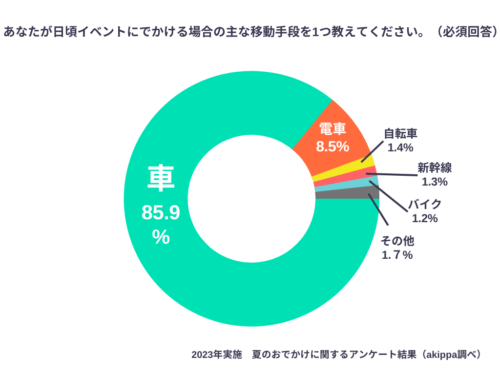 日頃イベントにでかける場合の主な移動手段を聞いたところ「車」(85.9%)が最多で8割以上の人が車を移動手段として利用していることがわかりました。