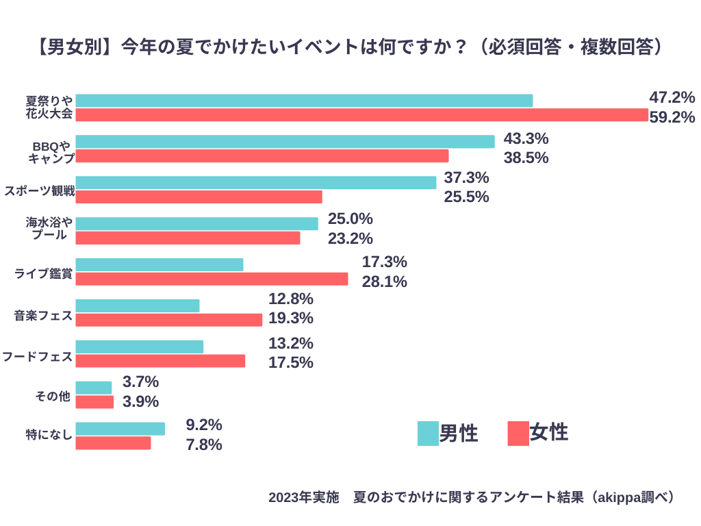 男女別に見てみると、女性は男性と比較して「夏祭りや花火大会」と回答した人の割合が多いという結果になりました。