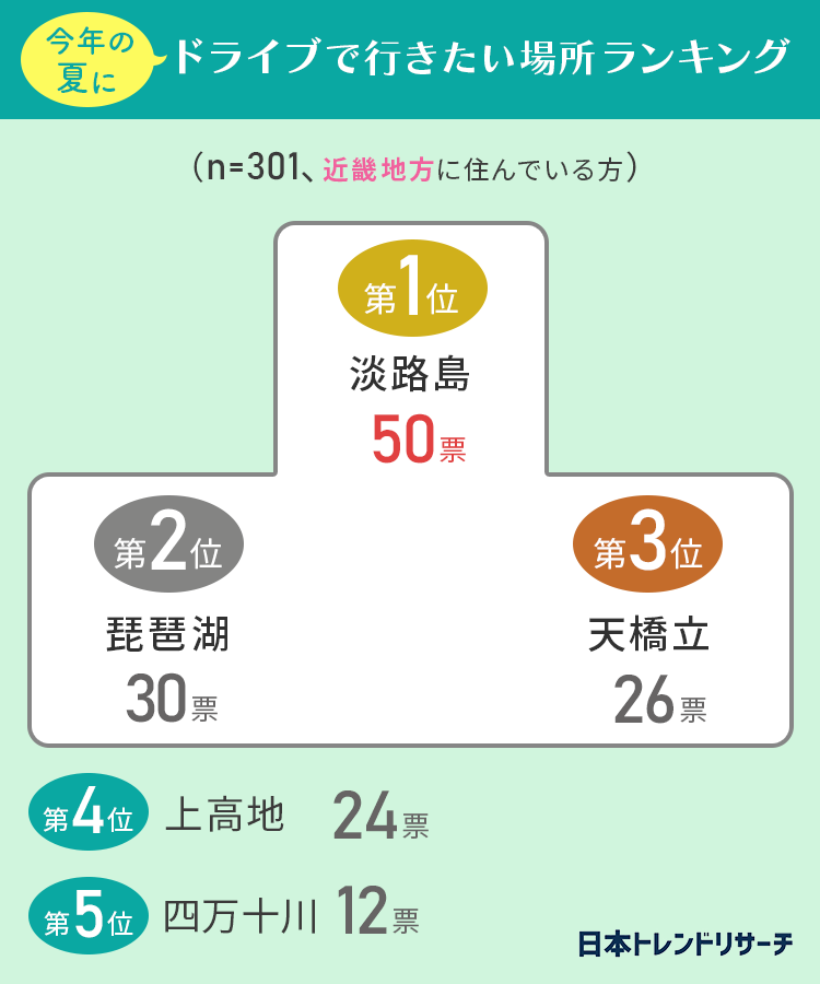 ドライブコースの定番ともいえる、淡路島や琵琶湖、天橋立などが高い人気を集めていました。