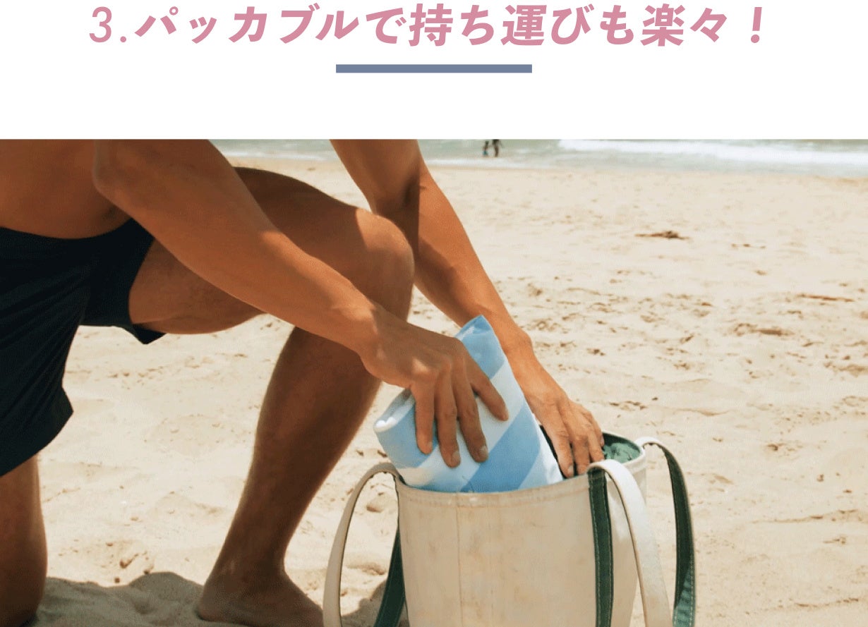 スーパーマイクロファイバー素材を使用しているので、砂がつきにくく後片付けも楽々です。また、肌触り、質感も高く、汗や水分などでベタベタしにくくなっています。