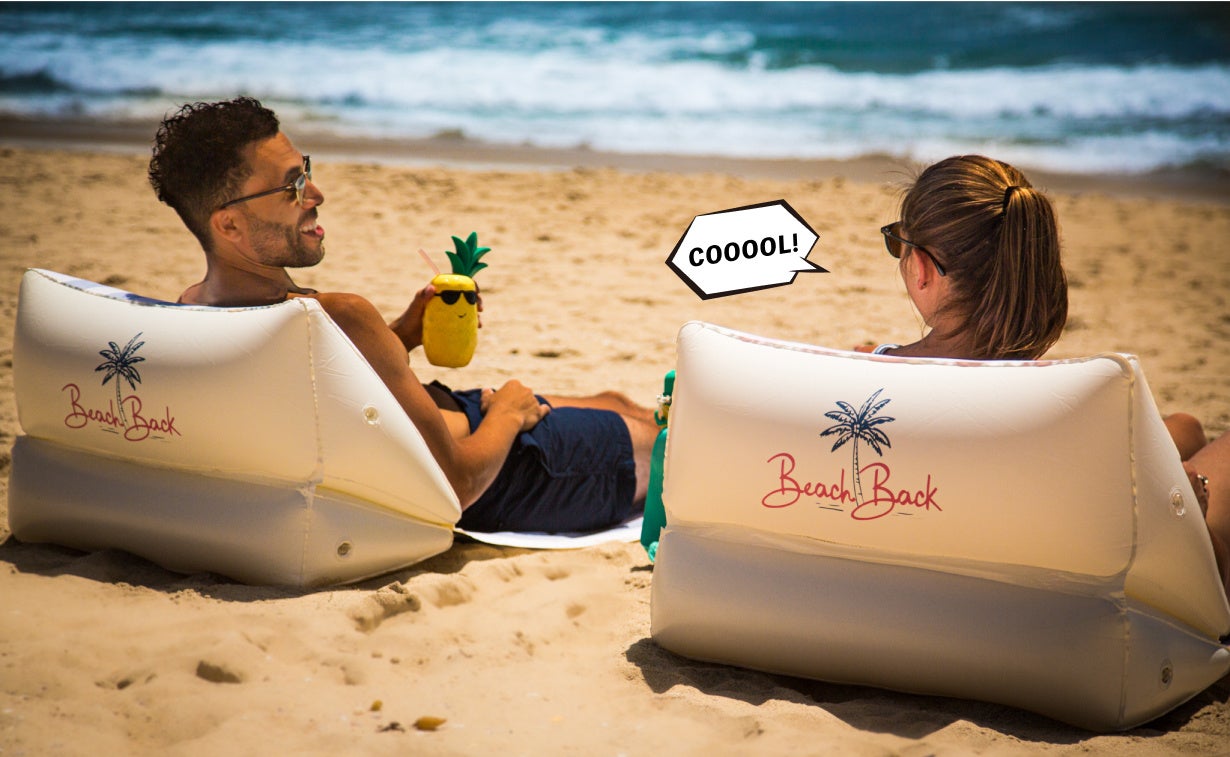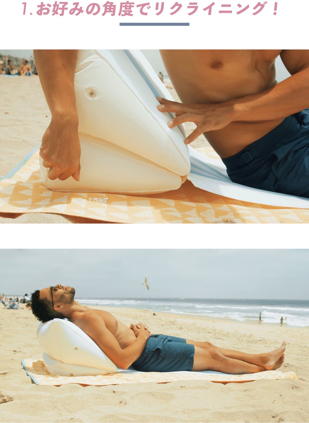 ビーチバックは、ビーチや公園などのアウトドアだけでなく、お部屋や寝室などどんな場所でも簡単に使用できる、エア注入式ポータブルエアーラウンジャーです!