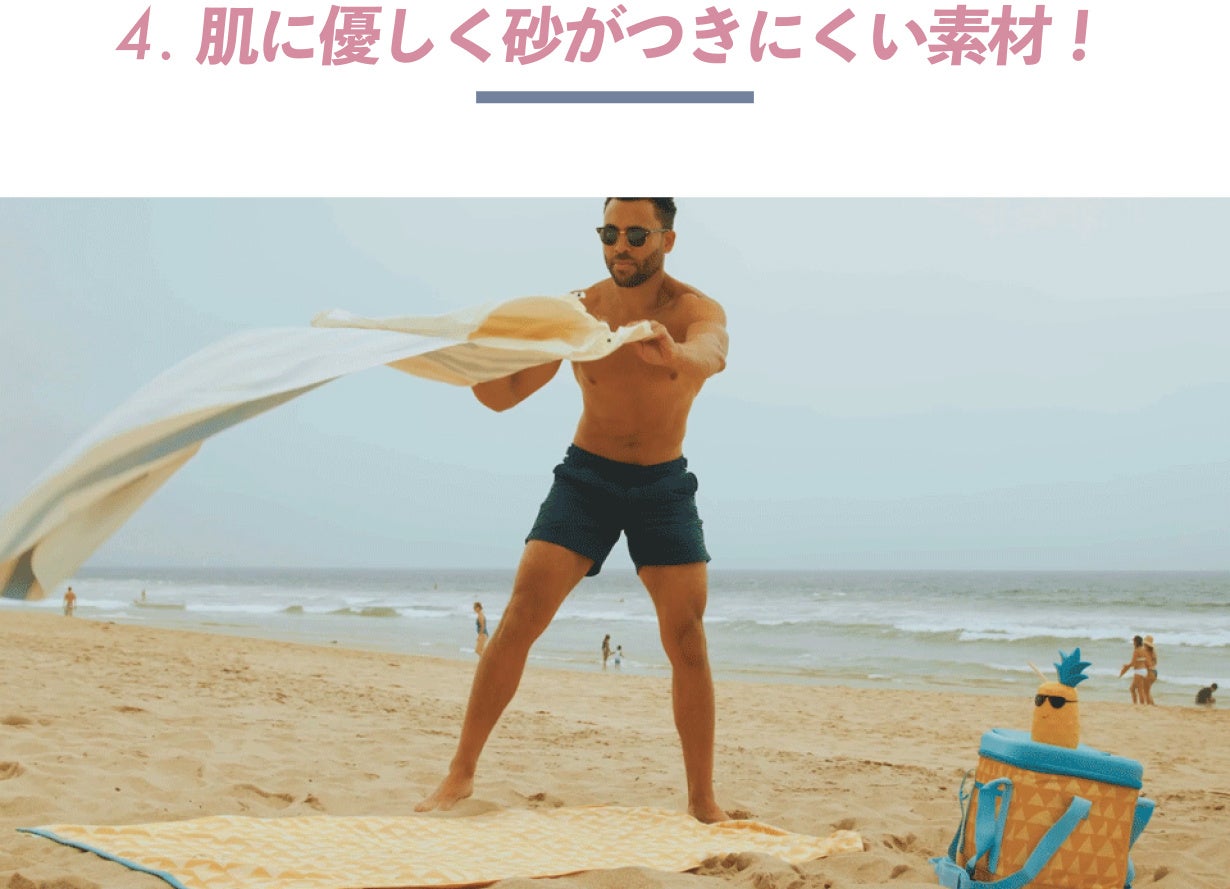 スーパーマイクロファイバー素材を使用しているので、砂がつきにくく後片付けも楽々です。また、肌触り、質感も高く、汗や水分などでベタベタしにくくなっています。