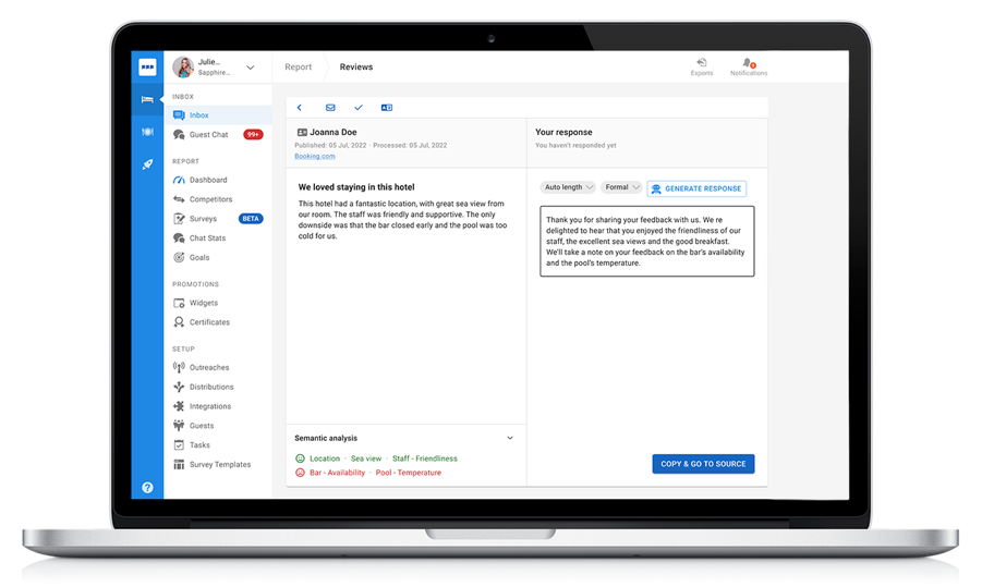 この度リリースされるクチコミ受信トレイとresponseAIの機能は、宿泊施設に多くのメリットをもたらすべく開発されました。新たなクチコミ受信トレイはクチコミ管理業務により効率的で合理的なワークフローをもたらし、クチコミ管理業務の担当者がゲストが投稿するクチコミコメントに素早くアクセスし、迅速に対応することを可能とします。さらに、resopnseAIは投稿されたクチコミコメントからゲストの肯定的(ポジティブ)および批判的(ネガティブ)な感情を認識し、それに応じたトーンに合った返答コメントを自動生成します。また、TrustYouのresponseAIは、多言語に対応できる翻訳機能を備えています。