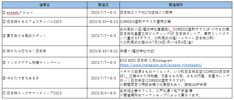 ECO EDO 日本橋 実行委員会および日本橋室町エリアマネジメントは、日本橋、八重洲、京橋エリアにおいて2023年7月7日(金)から9月3日(日)の期間、今年で15回目となる恒例の夏イベント『ECO EDO 日本橋 2023 ~めぐり、つなげる、江戸の知恵~』を開催します。