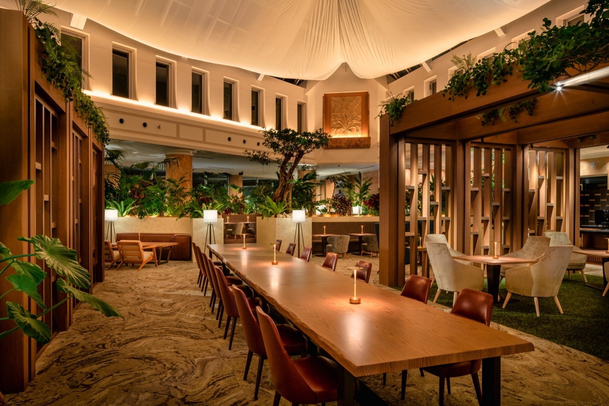 全室オーシャンビューで44 ㎡以上の広々とした客室(361室)が特徴で、2022年12月には最上階を含む14~15階の62室が、やんばるを体験する旅の拠点にさらにふさわしい空間へと生まれ変わりました。木漏れ日が降り注ぎ、やんばるの森に自生する植物をふんだんに配置した緑溢れるロビーエリアでは、ホテルのコンセプトである「島とあそぶ 森とつながる」をイメージした環境音楽が流れ、やんばるの夜の森に佇んでいるような没入感と、日常から切り離された開放感が交差する空間を演出しています。