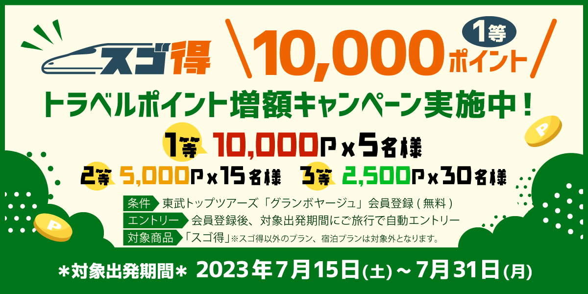 期間中に、当社が運営するサイトである「グランボヤージュ」に無料会員登録をしていただき、スゴ得商品(日帰り商品を含む)で旅行出発された方を対象に抽選を行い、1等:10,000ポイント×5名様 2等:5,000ポイント×15名様 3等:2,500ポイント×30名様 のポイントを付与いたします。対象期間中にグランボヤージュ会員でスゴ得商品を利用した方は自動エントリーされます。