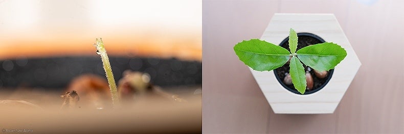 MODRINAEは、誰もが山づくりに参加できる新しい観葉植物です。どんぐりから苗木を育てるセットになっており、購入者の元で育った苗木は、ソマノベースが引き取り山へ植林します。育てる期間は約2年間。その後、苗木が植林される和歌山県の木材を使用した製品を購入することも可能です。