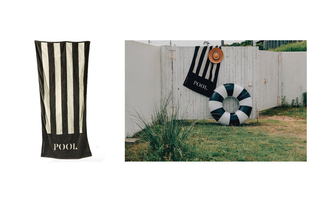 「POOL」のロゴが目を惹くデザイン。綿100%でお手入れ簡単、日常使いにおすすめ。大判サイズで、プールやビーチサイドはもちろん、アウトドアシーンではラグの代わりにも活躍し、1枚あると季節を問わず重宝します。