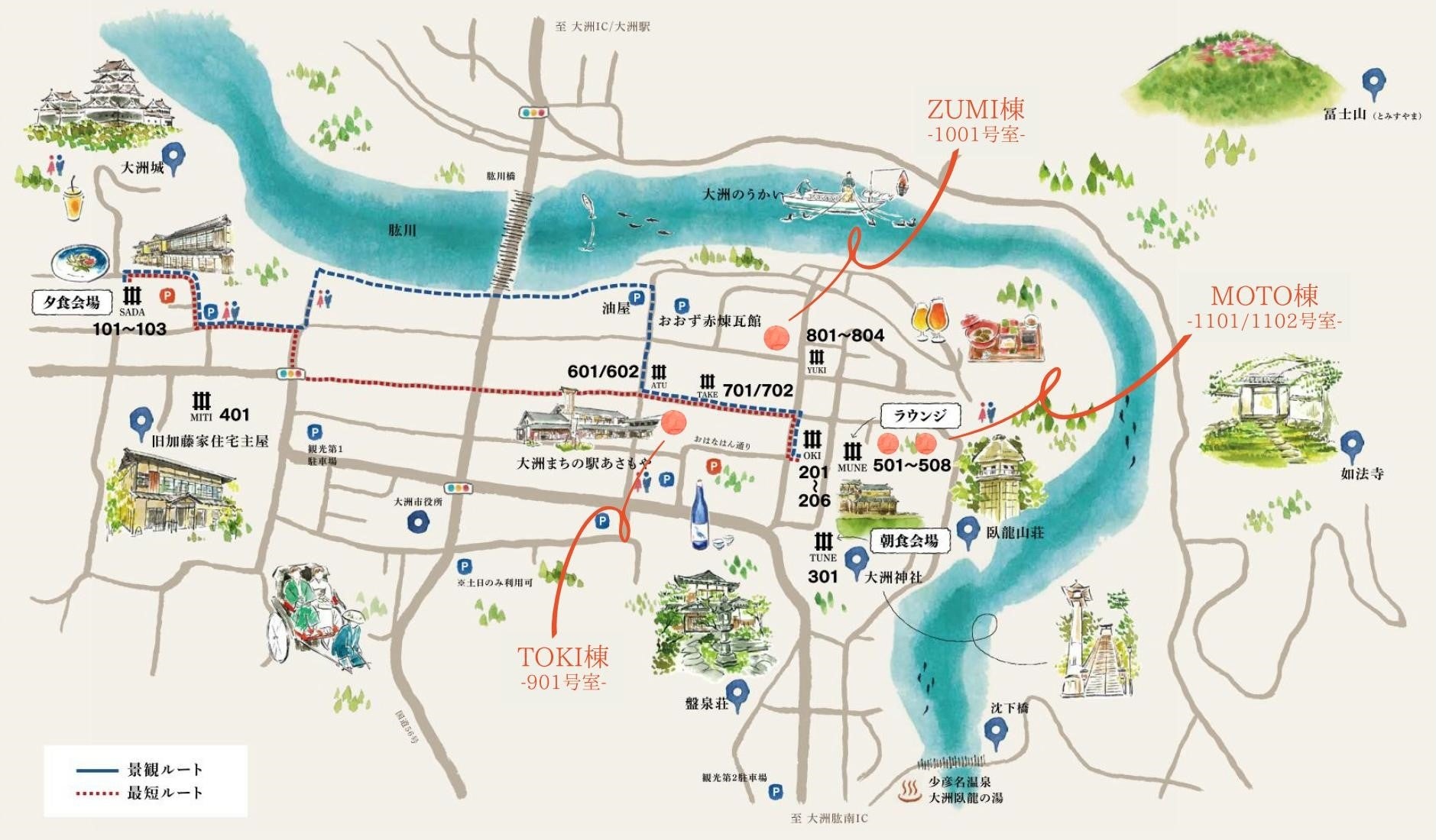 かつては「城戸酒店」としてまちに親しまれた建物を再生した「ZUMI」棟。檜風呂を配した一棟貸切のお部屋で、ゆっくりとお寛ぎいただけます。棟名には大洲藩主加藤家の「泰済(やすずみ)」の名を冠しています。