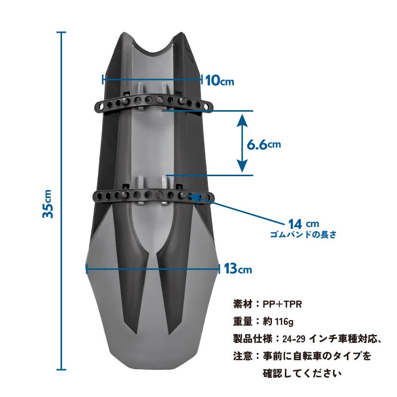 フェンダー本体:長さ約35cm, 幅10-13cm/ゴムバンド: 長さ14cm |