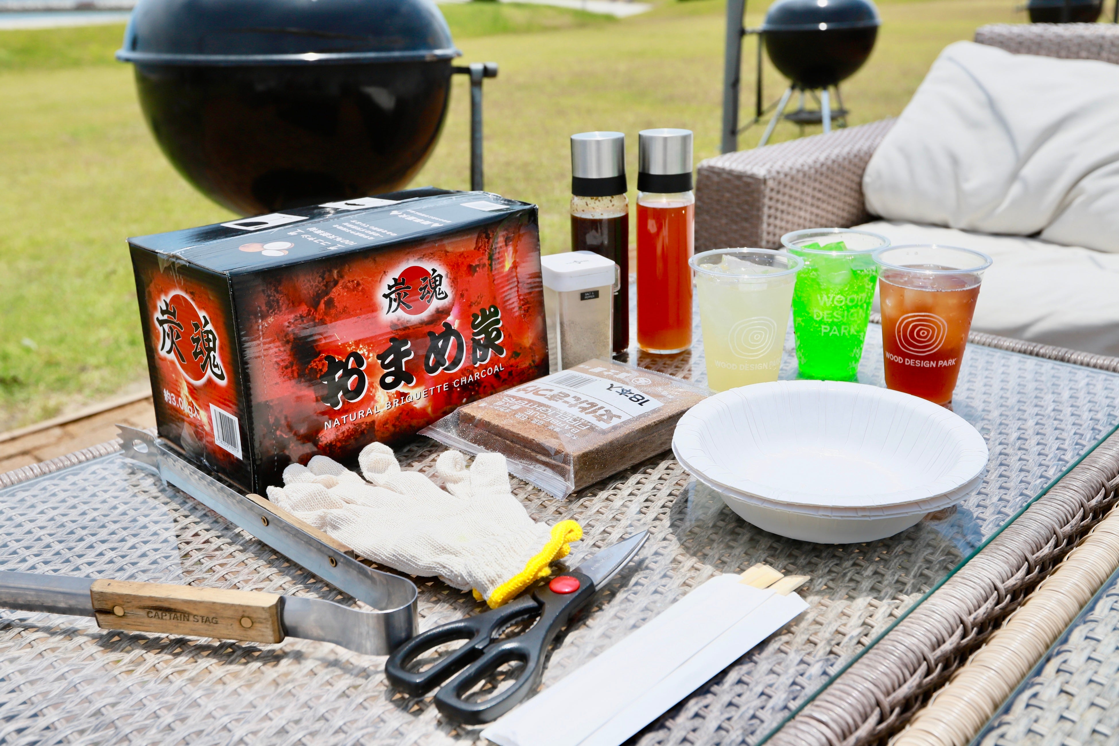 ●BBQセット(炭、炭用トング、着火剤、軍手、皿、箸、ハサミ、トング、塩胡椒、BBQソース)