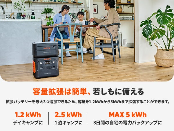 本体(1264Wh)と同容量の拡張バッテリー「Jackery Bettery Pack 1000 Plus」を最大3台まで接続できるため、バッテーリー容量を最大5kWhまで拡張できます。