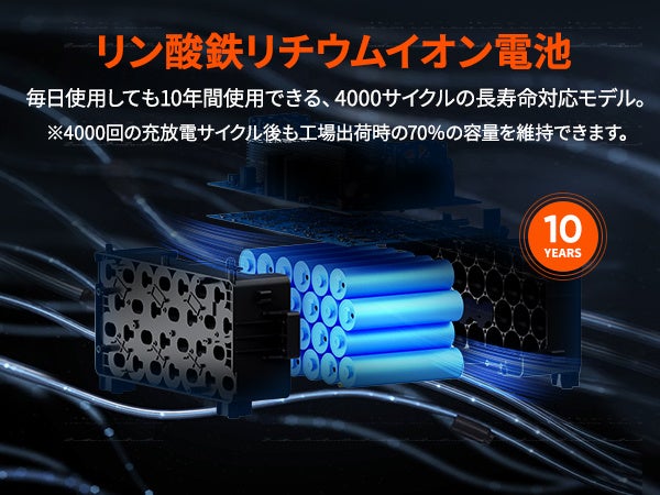 「Jackery ポータブル電源 2000 Plus」と同じLiFePO4リン酸鉄リチウムイオン電池採用により、毎日使用しても10年以上使える長寿命を実現。革新的なChargeShield(特許出願済)高速充電技術により、安全性を高め、バッテリー寿命を更に延長しました。