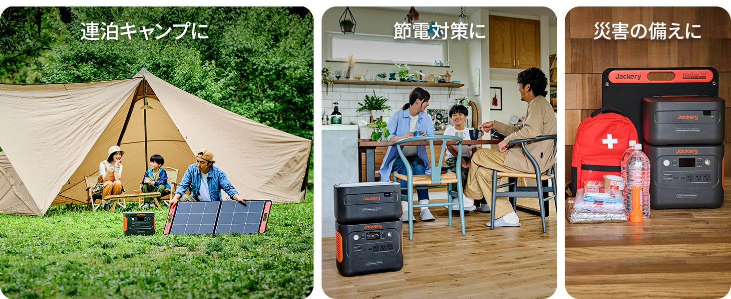 Jackery ポータブル電源とソーラーパネルを組み合わせれば太陽光で発電し、ポータブル電源に蓄電して電気が使えるので、環境にもやさしい電気を活用できます。自宅やオフィスでも電力の自給自足による電気代の削減に貢献することができます。