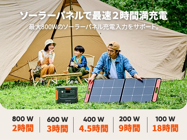「Jackery ポータブル電源 1000 Plus」は最大800Wのソーラーパネル充電入力をサポートし、200Wを4枚使用することで、最速2時間でフル充電することができます。また「Jackery SolarSaga 100/200」は高度なIBCテクノロジーにより、曇りなどの低照度状況での発電量が50%増加します。業界をリードする最大25%の太陽光変換効率により、多くの発電量が確保できます。