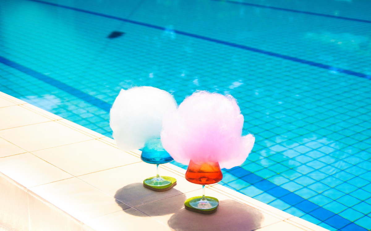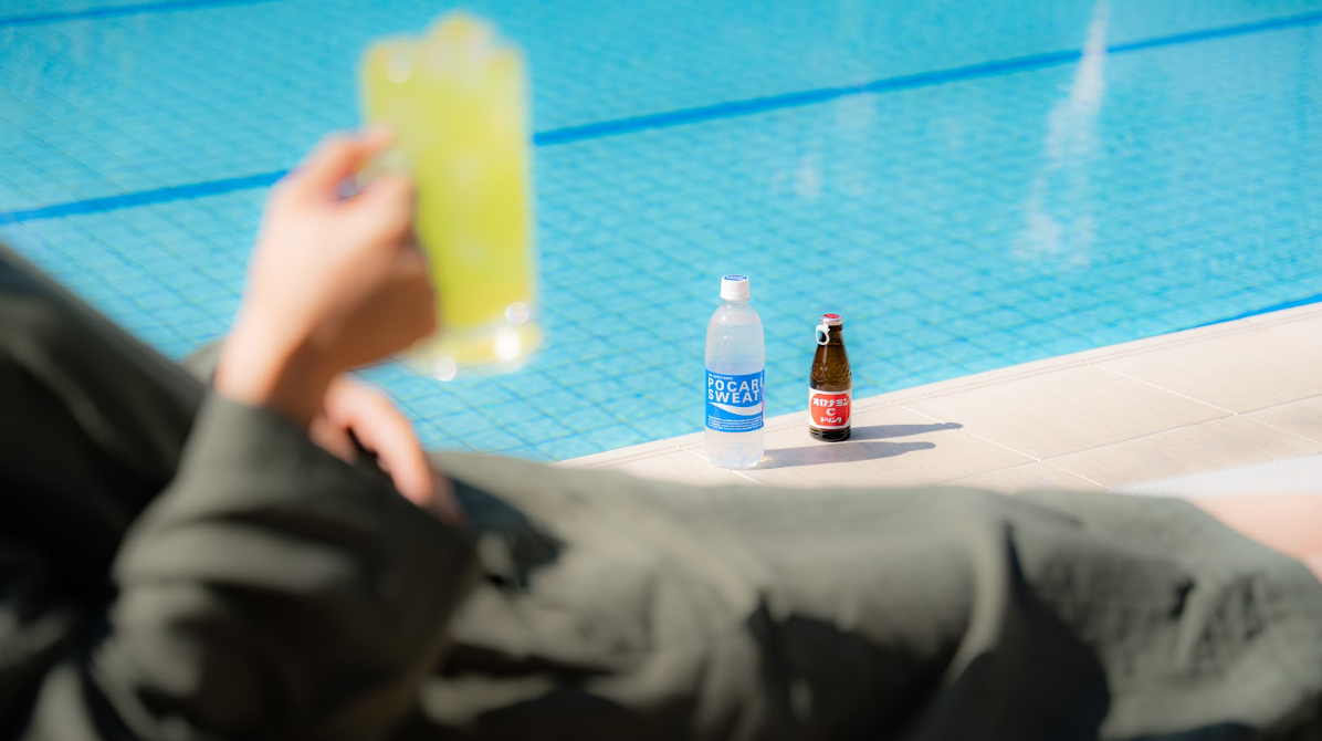 サウナ後は、プールサイドでサウナ飯とドリンクを。