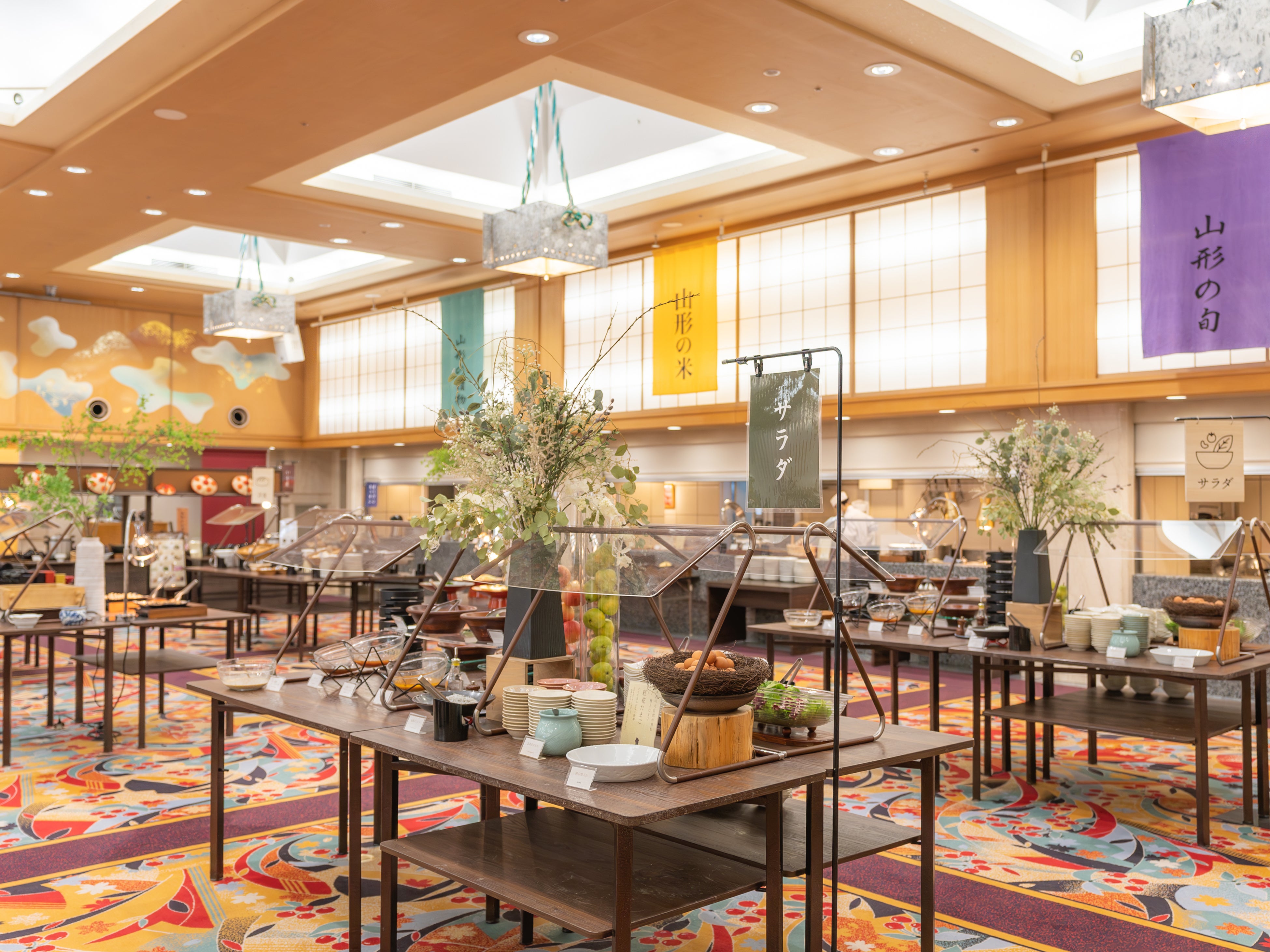 郷土料理をはじめ、山形の食材が楽しめる様々なお料理から、お好きなものをご自由にお取りいただけます。お子さまでもお召し上がりいただけるお料理をご用意しております。