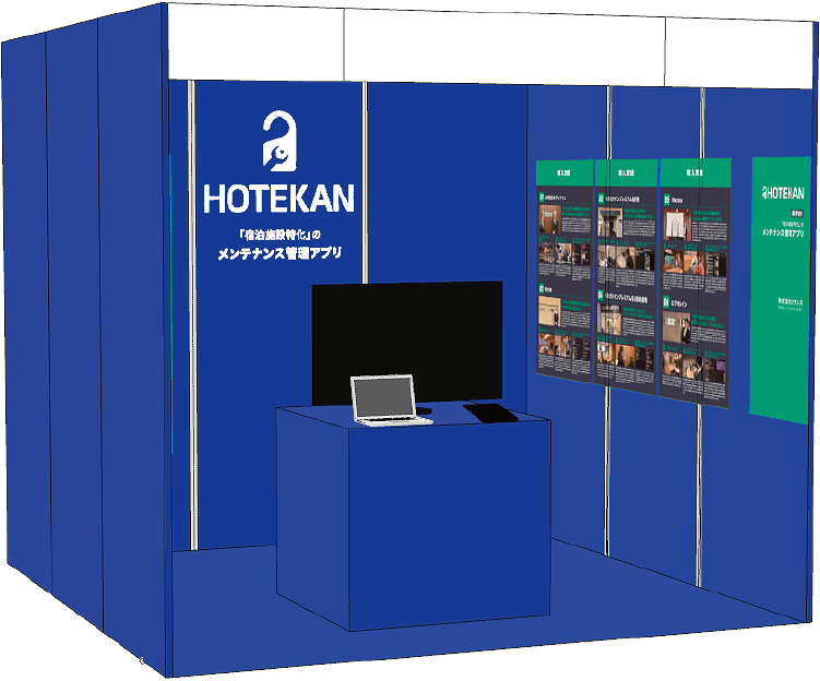 会場ブースで画面を見て頂きながら「HoteKan」の使い方や具体的な活用方法を紹介いたしますので、是非この機会にお立ち寄りください。IT導入補助金の活用も可能ですので、お気軽にご相談下さい。