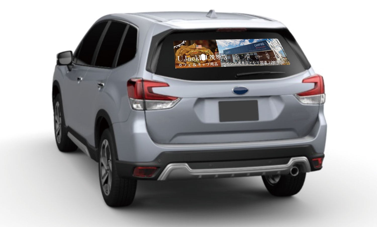 本キャンペーンでは、千葉のキャンプ用品ブランド「UJack」が手がけるコンセプトカフェ「UJackキャンプストア&カフェ茂原店」をPRしてくれるドライバー200名を募集します。参加者はPRステッカー(上図デザイン)を自家車のリアウィンドウに貼って、いつものようにドライブ。走行特典として、200km走行を達成した方に同カフェのホットサンド、500km走行を達成した方に店舗ロゴ入りチタンマグカップをプレゼントします。さらに、走行距離TOP3の方には、UJackむつざわオートキャンプ場エアストリームサイト無料宿泊券をプレゼントします。