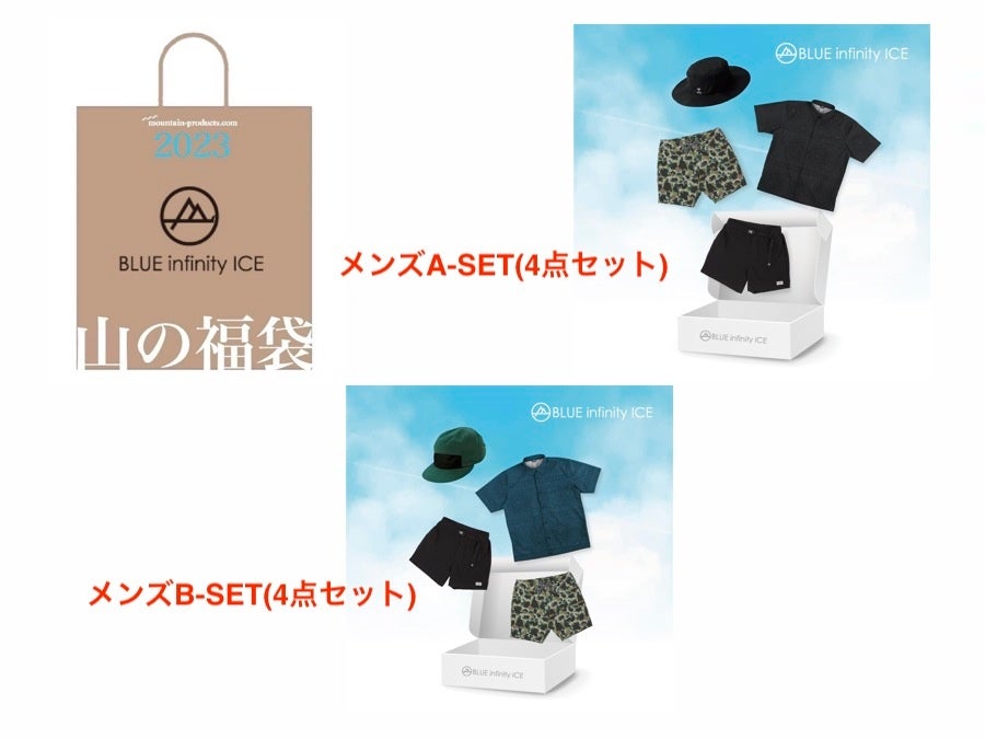 【BLUE infinity ICE 山の福袋2023】メンズA-SET(4点セット)と【BLUE infinity ICE 山の福袋2023】メンズB-SET(4点セット) の2種類を用意。水陸両用、アウトドアから街でも使用できるアパレルセット。