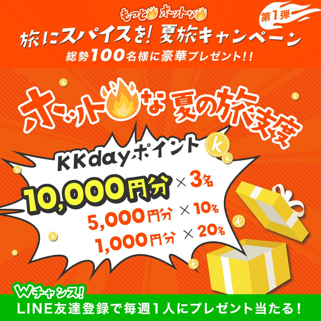 KKdayのTwitter公式アカウント(@KKdayJP)とLINE公式アカウントでは、2023 年7月10日(月)より5週連続で合計100名様にリゾートホテル宿泊券や旅行グッズなど豪華賞品が当たるキャンペーン「旅にスパイスを!もっとホットな夏旅キャンペーン」を実施します。